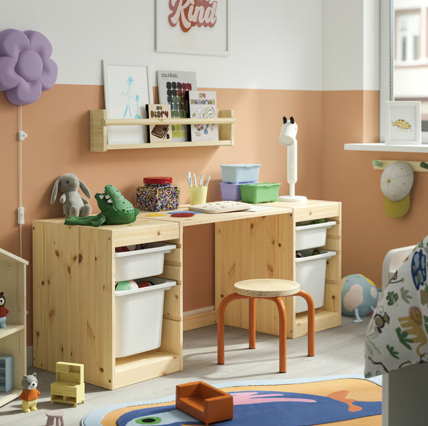 Este tablero se fija a dos estructuras TROFAST para crear un escritorio perfecto donde un niño pequeño puede dar rienda suelta a su creatividad en el juego y las manualidades.